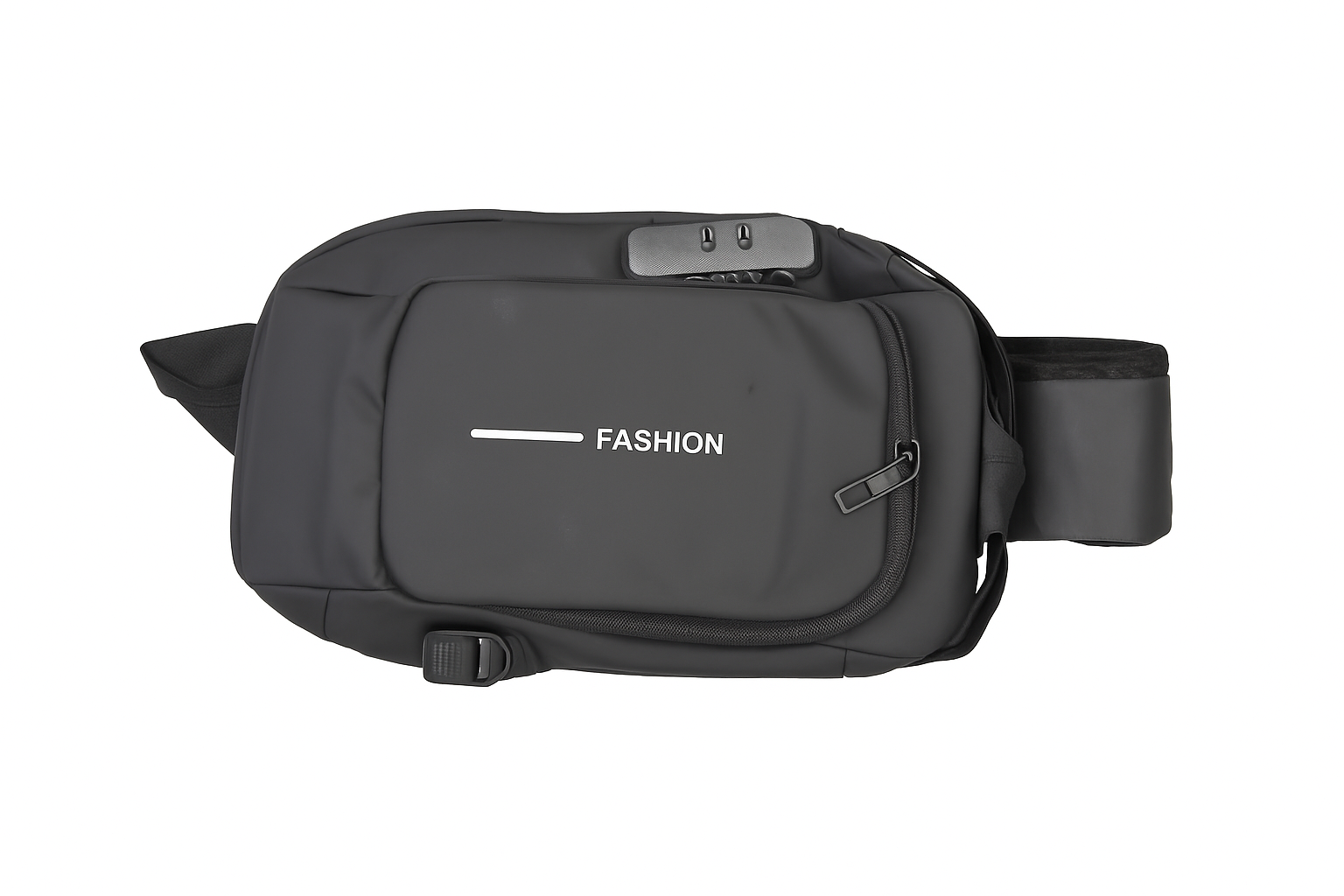 It features dual zippered compartments, an ergonomic adjustable strap, and a stylish “FASHION” logo on the front. Perfect for storing your phone, wallet, power bank, sunglasses, passport, and more.